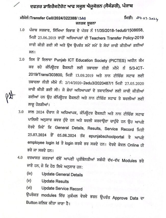 ਚੰਡੀਗੜ੍ਹ 25 ਜੁਲਾਈ। ਸਿੱਖਿਆ ਵਿਭਾਗ ਵੱਲੋਂ ਅਧਿਆਪਕਾਂ ਦੀ ਬਦਲੀਆਂ ਲਈ ਨਵੀਂ ਬਣਾਈ ਗਈ ਨੀਤੀ ਤਹਿਤ ਆਨਲਾਈਨ ਬਦਲੀਆਂ ਦੀ ਪ੍ਰਕਿਰਿਆ ਅੱਜ ਤੋਂ ਸ਼ੁਰੂ ਹੋ ਗਈ। ਵਿਭਾਗ ਵੱਲੋਂ ਬਦਲੀਆਂ ਲਈ ਪੋਰਟਲ ਖੋਲ ਦਿੱਤਾ ਗਿਆ ਹੈ ਜਿਸ ਉੱਪਰ 25 ਜੁਲਾਈ ਤੋਂ 5 ਅਗਸਤ ਤੱਕ ਅਧਿਆਪਕ ਆਪਣਾ ਡਾਟਾ ਭਰ ਕੇ ਬਦਲੀ ਅਪਲਾਈ ਕਰ ਸਕਣਗੇ। ਉਸ ਤੋਂ ਬਾਅਦ ਸਟੇਸ਼ਨ choice ਮਿਲੇਗੀ। ਜਿੱਥੇ ਅਧਿਆਪਕ ਆਪਣੀ ਮਰਜ਼ੀ ਨਾਲ ਸਟੇਸ਼ਨ ਭਰ ਸਕਣਗੇ। ਉਸ ਤੋਂ ਬਾਅਦ ਬਦਲੀਆਂ ਦੀ ਸੂਚੀ ਜਾਰੀ ਕੀਤੀ ਜਾਵੇਗੀ। ਸਿੱਖਿਆ ਵਿਭਾਗ ਵੱਲੋਂ 24 ਜੁਲਾਈ ਨੂੰ ਜਾਰੀ ਕੀਤੇ ਗਏ ਪੱਤਰ ਤਹਿਤ ਖਾਸ ਹਦਾਇਤ ਕੀਤੀ ਗਈ ਹੈ ਕਿ 5 ਅਗਸਤ ਤੱਕ ਸਿਰਫ ਆਨਲਾਈਨ ਹੀ ਬਦਲੀ ਅਪਲਾਈ ਹੋਵੇਗੀ ਆਫਲਾਈਨ ਕੋਈ ਵੀ ਬਦਲੀ ਨਹੀਂ ਕੀਤੀ ਜਾਵੇਗੀ। ਅਧਿਆਪਕ ਆਪਣੇ ਈ ਪੰਜਾਬ ਸਕੂਲ ਪੋਰਟਲ ਤੇ ਇਮਪਲੋਈ ਲੋਗਿਨ ਆਈਡੀ ਤੇ ਲੋਗਇਨ ਕਰਕੇ ਡਾਟਾ ਭਰ ਸਕਦੇ ਹਨ। ਜਿਨਾਂ ਦੇ ਵੇਰਵੇ ਗਲਤ ਪਾਏ ਗਏ ਉਹਨਾਂ ਦੀ ਬਦਲੀ ਲਈ ਬੇਨਤੀ ਨੂੰ ਵਿਚਾਰਿਆ ਨਹੀਂ ਜਾਵੇਗਾ ਇਸ ਲਈ ਅਧਿਆਪਕ ਧਿਆਨ ਨਾਲ ਡਾਟਾ ਭਰਨ। ਜਿਨ੍ਹਾਂ ਨੇ ਮਾਰਚ ਮਹੀਨੇ ਦੇ ਵਿੱਚ ਖੁੱਲੇ ਪੋਰਟਲ ਤੇ ਆਪਣਾ ਡਾਟਾ ਭਰਿਆ ਸੀ ਉਹਨਾਂ ਨੂੰ ਵੀ ਦੁਬਾਰਾ ਡਾਟਾ ਭਰਨਾ ਪਵੇਗਾ। ਦੱਸਣ ਯੋਗ ਹੈ ਕਿ ਲੋਕ ਸਭਾ ਚੋਣਾਂ ਤੋਂ ਪਹਿਲਾਂ ਪੋਰਟਲ ਖੋਲਿਆ ਗਿਆ ਸੀ ਪਰ ਉਸ ਉੱਪਰ ਬਦਲੀਆਂ ਅਪਲਾਈ ਨਹੀਂ ਹੋ ਸਕੀਆਂ ਸਨ। ਹੁਣ ਦੁਬਾਰਾ ਵਿਭਾਗ ਵੱਲੋਂ ਪੋਰਟਲ ਖੋਲ ਦਿੱਤਾ ਗਿਆ ਹੈ ਜਿਸ ਉੱਪਰ ਅਧਿਆਪਕ ਆਪਣੀ ਬਦਲੀ ਅਪਲਾਈ ਕਰ ਸਕਣਗੇ।