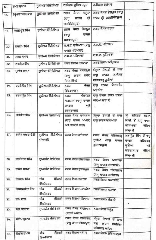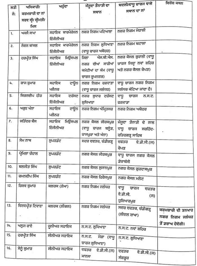 ਸਥਾਨਕ ਸਰਕਾਰਾਂ ਵਿਭਾਗ ਵਿੱਚ ਅਧਿਕਾਰੀਆਂ ਤੇ ਕਰਮਚਾਰੀਆਂ ਦੇ ਹੋਏ ਤਬਾਦਲੇ