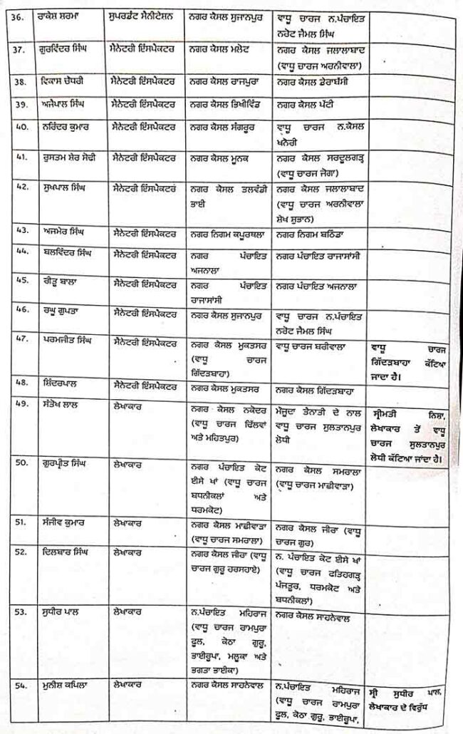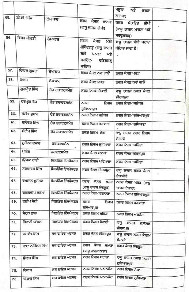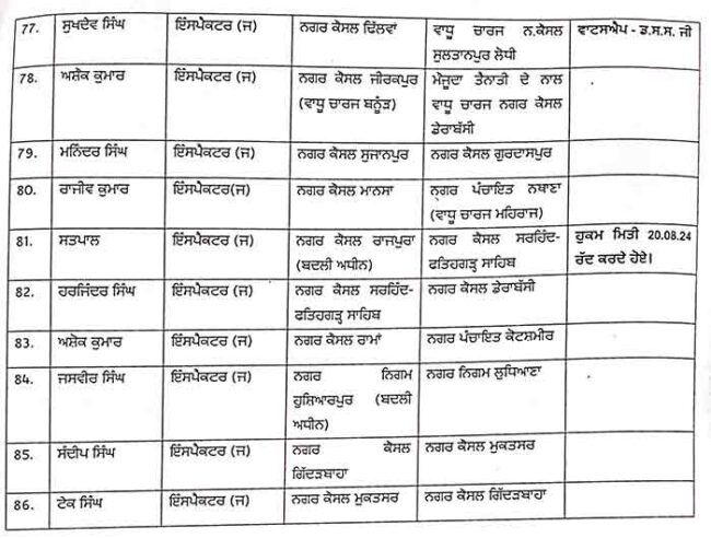 ਸਥਾਨਕ ਸਰਕਾਰਾਂ ਵਿਭਾਗ ਪੰਜਾਬ ਵੱਲੋਂ ਵੱਖ-ਵੱਖ ਅਧਿਕਾਰੀਆਂ ਤੇ ਕਰਮਚਾਰੀਆਂ ਦੇ ਤਬਾਦਲੇ ਕੀਤੇ ਗਏ ਹਨ।ਜਿਸ ਤਹਿਤ 86 ਤਬਾਦਲੇ ਹੋਏ। ਵੇਖੋ ਸੂਚੀ