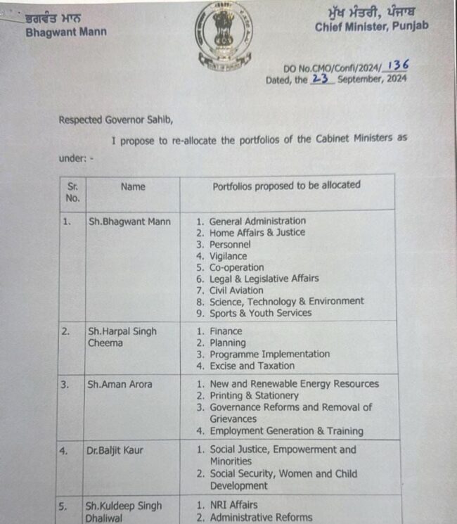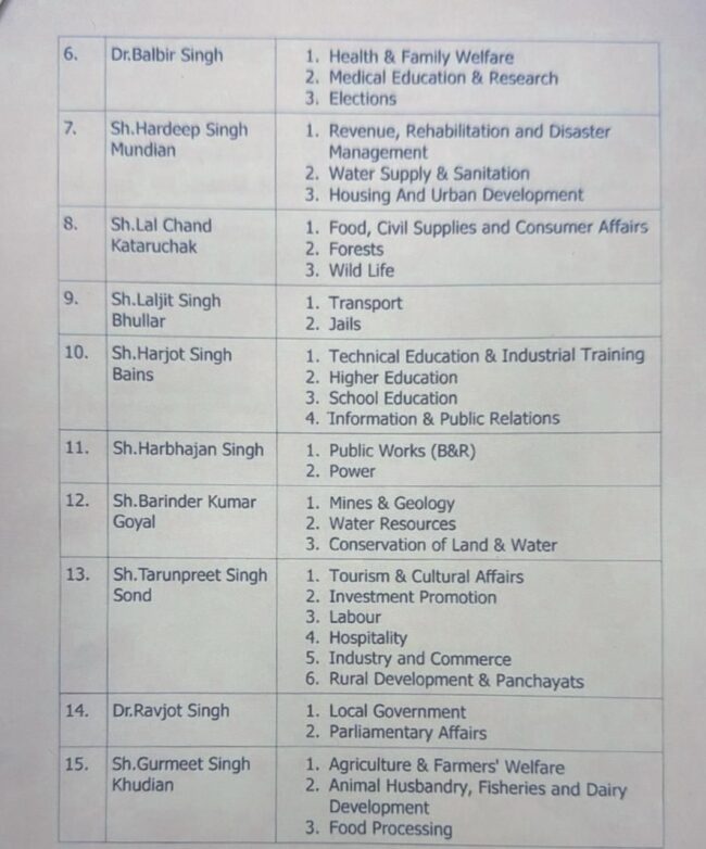 ਮੁੱਖ ਮੰਤਰੀ ਵੱਲੋਂ ਮੰਤਰੀਆਂ ਦੇ ਵਿਭਾਗਾਂ ਦੀ ਵੰਡ