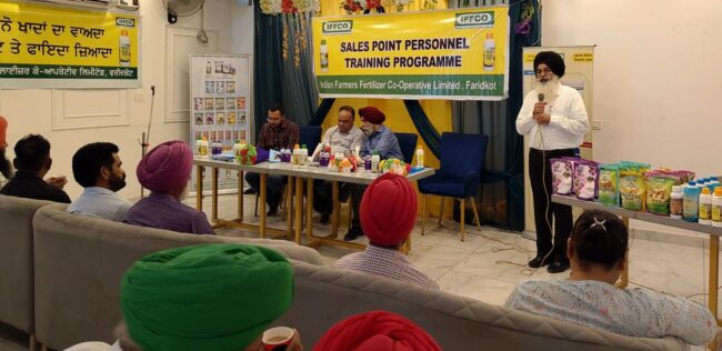 ਫਰੀਦਕੋਟ : 29 ਸਤੰਬਰ। ਦੁਨੀਆਂ ਦੀ ਨੰਬਰ ਇਕ ਸਹਿਕਾਰੀ ਖਾਦ ਸੰਸਥਾ ਇਫਕੋ ਵੱਲੋਂ ਜ਼ਿਲ੍ਹਾ ਫਰੀਦਕੋਟ ਵਿਖੇ ਇੱਕ ਵਿਕਰੀ ਕੇਂਦਰ ਕਰਮਚਾਰੀ ਸਿਖਲਾਈ ਪ੍ਰੋਗਰਾਮ ਦਾ ਆਯੋਜਨ ਸਥਾਨਕ ਮਹਾਰਾਜ ਢਾਬੇ ਵਿਚ ਕਰਵਾਇਆ ਗਿਆ। ਇਸ ਪ੍ਰੋਗਰਾਮ ਦੀ ਅਗਵਾਈ ਸ. ਹਰਮੇਲ ਸਿੰਘ ਸਿੱਧੂ, ਸਟੇਟ ਮਾਰਕੀਟਿੰਗ ਮੈਨੇਜਰ,ਇਫਕੋ,ਪੰਜਾਬ ਦੁਆਰਾ ਕੀਤੀ ਗਈ। ਇਸ ਪ੍ਰੋਗਰਾਮ ਵਿੱਚ ਡਾ.ਅਮਰੀਕ ਸਿੰਘ ਮੁੱਖ ਖੇਤੀਬਾੜੀ ਅਫਸਰ ਮੁੱਖ ਮਹਿਮਾਨ ਅਤੇ ਉਪ ਰਜਿਸਟਰਾਰ ਸਹਿਕਾਰੀ ਸਭਾਵਾਂ ਰਾਜਪਾਲ ਸਿੰਘ ਵਿਸ਼ੇਸ਼ ਮਹਿਮਾਨ ਵਜੋਂ ਸ਼ਾਮਿਲ ਹੋਏ ।