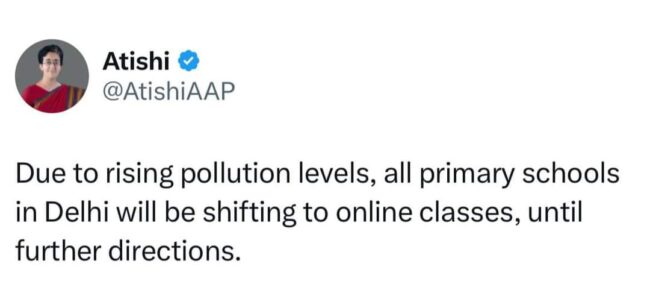 ਦਿੱਲੀ ਵਿੱਚ ਲਗਾਤਾਰ ਵੱਧ ਰਹੇ ਪ੍ਰਦੂਸ਼ਣ ਦੇ ਮੱਦੇਨਜ਼ਰ ਦਿੱਲੀ ਦੇ ਮੁੱਖ ਮੰਤਰੀ ਆਤਿਸ਼ੀ ਵੱਲੋਂ ਵੱਡਾ ਫੈਸਲਾ ਲਿਆ ਗਿਆ ਹੈ। ਉਹਨਾਂ ਵੱਲੋਂ ਦਿੱਲੀ ਦੇ ਸਾਰੇ ਸਰਕਾਰੀ ਪ੍ਰਾਇਮਰੀ ਸਕੂਲ ਬੰਦ ਕਰਨ ਦੇ ਹੁਕਮ ਜਾਰੀ ਕੀਤੇ ਗਏ ਹਨ। ਆਪਣੇ ਸੋਸ਼ਲ ਮੀਡੀਆ ਪਲੇਟਫਾਰਮ ਐਕਸ ਉੱਪਰ ਮੁੱਖ ਮੰਤਰੀ ਆਤਸ਼ੀ ਨੇ ਲਿਖਿਆ ਹੈ ਕਿ ਦਿੱਲੀ ਵਿੱਚ ਵੱਧ ਰਹੇ ਪ੍ਰਦੂਸ਼ਣ ਦੇ ਮੱਦੇ ਨਜ਼ਰ ਸਾਰੇ ਸਰਕਾਰੀ ਪ੍ਰਾਇਮਰੀ ਸਕੂਲ ਅਗਲੇ ਹੁਕਮਾਂ ਤੱਕ ਬੰਦ ਕੀਤੇ ਜਾਣ ਤੇ ਬੱਚਿਆਂ ਦੀ ਪੜ੍ਹਾਈ ਦਾ ਧਿਆਨ ਰੱਖਦਿਆਂ ਆਨਲਾਈਨ ਕਲਾਸਾਂ ਲਾਈਆਂ ਜਾਣ ਤਾਂ ਜੋ ਬੱਚਿਆਂ ਦੀ ਪੜ੍ਹਾਈ ਵੀ ਖਰਾਬ ਨਾ ਹੋਵੇ। ਦੱਸਣ ਯੋਗ ਹੈ ਕਿ ਭਾਜਪਾ ਦੇ ਦਿੱਲੀ ਇਕਾਈ ਦੇ ਪ੍ਰਧਾਨ ਵੱਲੋਂ ਪ੍ਰਾਇਮਰੀ ਸਕੂਲਾਂ ਨੂੰ ਬੰਦ ਕਰਨ ਦੀ ਮੰਗ ਕੀਤੀ ਗਈ ਸੀ। ਮੁੱਖ ਮੰਤਰੀ ਦੇ ਹੁਕਮਾਂ ਤੇ ਤੁਰੰਤ ਕਾਰਵਾਈ ਹੁੰਦੇ ਆ ਦਿੱਲੀ ਦੇ ਸਰਕਾਰੀ ਤੇ ਪ੍ਰਾਈਵੇਟ ਪ੍ਰਾਇਮਰੀ ਸਕੂਲਾਂ ਨੂੰ ਬੰਦ ਕਰਨ ਦੇ ਹੁਕਮ ਜਾਰੀ ਹੋਏ ਹਨ।
