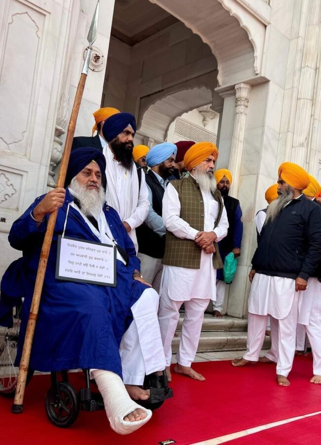 ਸ਼੍ਰੀ ਅਕਾਲ ਤਖਤ ਸਾਹਿਬ ਵੱਲੋਂ ਕੱਲ ਸ਼੍ਰੋਮਣੀ ਅਕਾਲੀ ਦਲ ਦੇ ਪ੍ਰਧਾਨ ਤੇ ਸਾਬਕਾ ਉਪ ਮੁੱਖ ਮੰਤਰੀ ਸੁਖਬੀਰ ਸਿੰਘ ਬਾਦਲ ਤੇ ਅਕਾਲੀ ਲੀਡਰਾਂ ਨੂੰ ਸੁਣਾਈ ਗਈ ਸਜ਼ਾ ਤੋਂ ਬਾਅਦ ਅੱਜ ਤੋਂ ਸੁਖਬੀਰ ਬਾਦਲ ਤੇ ਹੋਰ ਲੀਡਰਾਂ ਵੱਲੋਂ ਸਜ਼ਾ ਭੁਗਤਣੀ ਸ਼ੁਰੂ ਕੀਤੀ ਗਈ। ਅੱਜ ਸੁਖਬੀਰ ਸਿੰਘ ਬਾਦਲ ਸੇਵਾਦਾਰਾਂ ਵਾਲਾ ਚੋਲਾ ਪਾ ਕੇ ਪਹਿਰੇਦਾਰੀ ਦੀ ਸੇਵਾ ਕਰਦੇ ਨਜ਼ਰ ਆਏ ਇਸ ਤੋਂ ਬਾਅਦ ਉਹਨਾਂ ਨੇ ਜੂਠੇ ਬਰਤਨਾ ਦੀ ਸੇਵਾ ਕੀਤੀ। ਉਹਨਾਂ ਦੇ ਨਾਲ ਹੀ ਸੁਖਦੇਵ ਸਿੰਘ ਢੀਡਸਾ ਵੀ ਆਪਣੀ ਸਜ਼ਾ ਭੁਗਤ ਰਹੇ ਸਨ। ਇਸ ਤੋਂ ਇਲਾਵਾ ਪ੍ਰੇਮ ਸਿੰਘ ਚੰਦੂਮਾਜਰਾ ਸਮੇਤ ਬਾਗੀ ਅਕਾਲੀ ਆਗੂਆਂ ਵੱਲੋਂ ਵੀ ਬਾਥਰੂਮ ਸਾਫ ਕਰਨ ਦੀ ਸੇਵਾ ਕੀਤੀ ਗਈ।