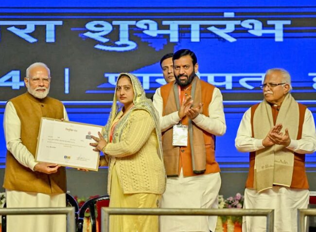 ਪ੍ਰਧਾਨ ਮੰਤਰੀ ਸ਼੍ਰੀ ਨਰਿੰਦਰ ਮੋਦੀ ਅੱਜ ਹਰਿਆਣਾ ਦੇ ਪਾਣੀਪਤ ਵਿੱਚ ਪਹੁੰਚੇ ਜਿੱਥੇ ਉਹਨਾਂ ਨੇ ਔਰਤਾਂ ਨੂੰ ਤੋਹਫਾ ਦਿੰਦਿਆਂ ਉਹਨਾਂ ਲਈ ਬੀਮਾ ਸਖੀ ਯੋਜਨਾ ਦੀ ਸ਼ੁਰੂਆਤ ਕੀਤੀ। ਇਸ ਮੌਕੇ ਤੇ ਮੁੱਖ ਮੰਤਰੀ ਨਾਇਬ ਸਿੰਘ ਸੈਣੀ ਨੇ ਪ੍ਰਧਾਨ ਮੰਤਰੀ ਦਾ ਨਿੱਘਾ ਸਵਾਗਤ ਕੀਤਾ। 50 ਹਜਾਰ ਤੋਂ ਵੱਧ ਲੋਕਾਂ ਦੀ ਸ਼ਮੂਲੀਅਤ ਵਾਲੇ ਇਸ ਪ੍ਰੋਗਰਾਮ ਵਿੱਚ ਮੁੱਖ ਮੰਤਰੀ ਵੱਲੋਂ ਪ੍ਰਧਾਨ ਮੰਤਰੀ ਨੂੰ ਪਰਾਲੀ ਨਾਲ ਬਣੀ ਉਹਨਾਂ ਦੀ ਤਸਵੀਰ ਵੀ ਭੇਂਟ ਕੀਤੀ।