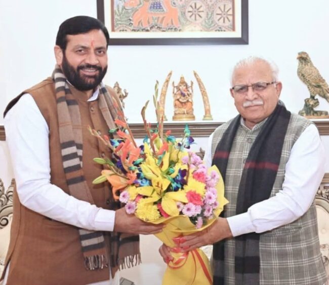 ਨਵੀਂ ਦਿੱਲੀ 16 ਦਸੰਬਰ।ਹਰਿਆਣਾ ਦੇ ਮੁੱਖ ਮੰਤਰੀ ਸ਼੍ਰੀ ਨਾਇਬ ਸਿੰਘ ਸੈਣੀ ਨੇ ਅੱਜ ਨਵੀਂ ਦਿੱਲੀ ਵਿੱਚ ਕੇਂਦਰੀ ਮੰਤਰੀ ਸ਼੍ਰੀ ਮਨੋਹਰ ਲਾਲ ਖੱਟਰ ਨਾਲ ਮੁਲਾਕਾਤ ਕੀਤੀ। ਇਸ ਦੌਰਾਨ ਉਹਨਾਂ ਨੇ ਵੱਖ-ਵੱਖ ਵਿਸ਼ਿਆਂ ਤੇ ਚਰਚਾ ਕੀਤੀ। ਹਰਿਆਣੇ ਦੀ ਵਿਕਾਸ ਨੂੰ ਲੈ ਕੇ ਮੁੱਖ ਮੰਤਰੀ ਵੱਲੋਂ ਕੇਂਦਰੀ ਮੰਤਰੀ ਨਾਲ ਚਰਚਾ ਕਰਦਿਆ ਕਿਹਾ ਕਿ ਹਰਿਆਣਾ ਪ੍ਰਧਾਨ ਮੰਤਰੀ ਸ਼੍ਰੀ ਨਰਿੰਦਰ ਮੋਦੀ ਦੇ ਯੋਗ ਦਿਸ਼ਾ ਨਿਰਦੇਸ਼ਾਂ ਤੇ ਤਰੱਕੀ ਵੱਲ ਵੱਧ ਰਿਹਾ ਹੈ। ਕਿਸਾਨ ਹਿੱਤਾਂ ਲਈ ਵੀ ਸੂਬਾ ਸਰਕਾਰ ਅਹਿਮ ਕੰਮ ਕਰ ਰਹੀ ਹੈ।