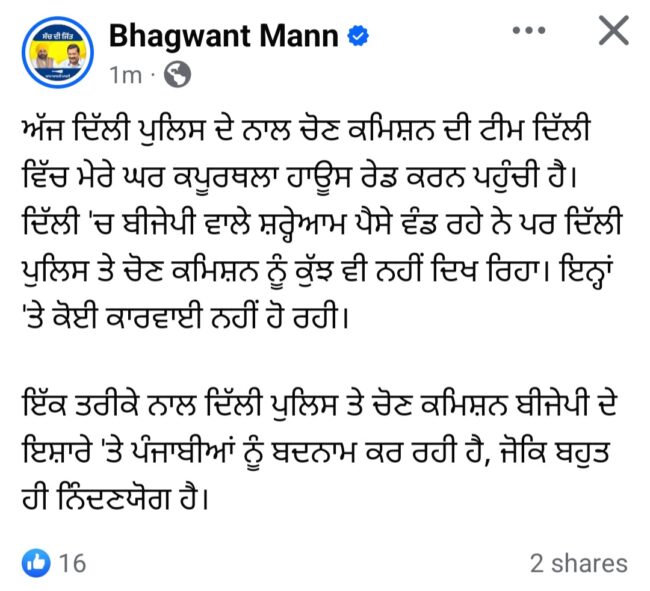 ਉਹਨਾਂ ਕਿਹਾ ਕਿ “ਅੱਜ ਦਿੱਲੀ ਪੁਲਿਸ ਦੇ ਨਾਲ ਚੋਣ ਕਮਿਸ਼ਨ ਦੀ ਟੀਮ ਦਿੱਲੀ ਵਿੱਚ ਮੇਰੇ ਘਰ ਕਪੂਰਥਲਾ ਹਾਊਸ ਰੇਡ ਕਰਨ ਪਹੁੰਚੀ ਹੈ। ਦਿੱਲੀ ‘ਚ ਬੀਜੇਪੀ ਵਾਲੇ ਸ਼ਰ੍ਹੇਆਮ ਪੈਸੇ ਵੰਡ ਰਹੇ ਨੇ ਪਰ ਦਿੱਲੀ ਪੁਲਿਸ ਤੇ ਚੋਣ ਕਮਿਸ਼ਨ ਨੂੰ ਕੁੱਝ ਵੀ ਨਹੀਂ ਦਿਖ ਰਿਹਾ। ਇਨ੍ਹਾਂ ‘ਤੇ ਕੋਈ ਕਾਰਵਾਈ ਨਹੀਂ ਹੋ ਰਹੀ।