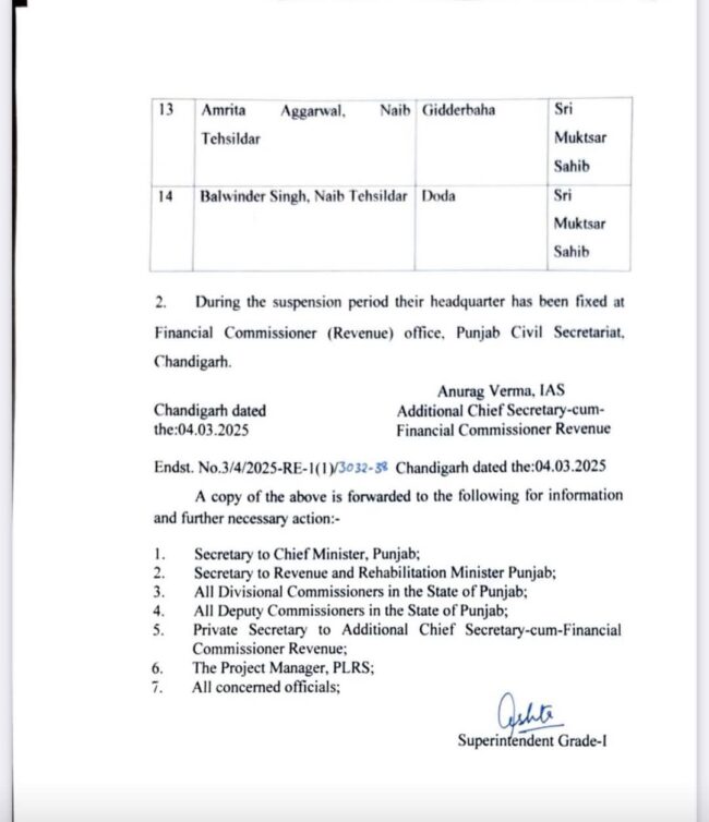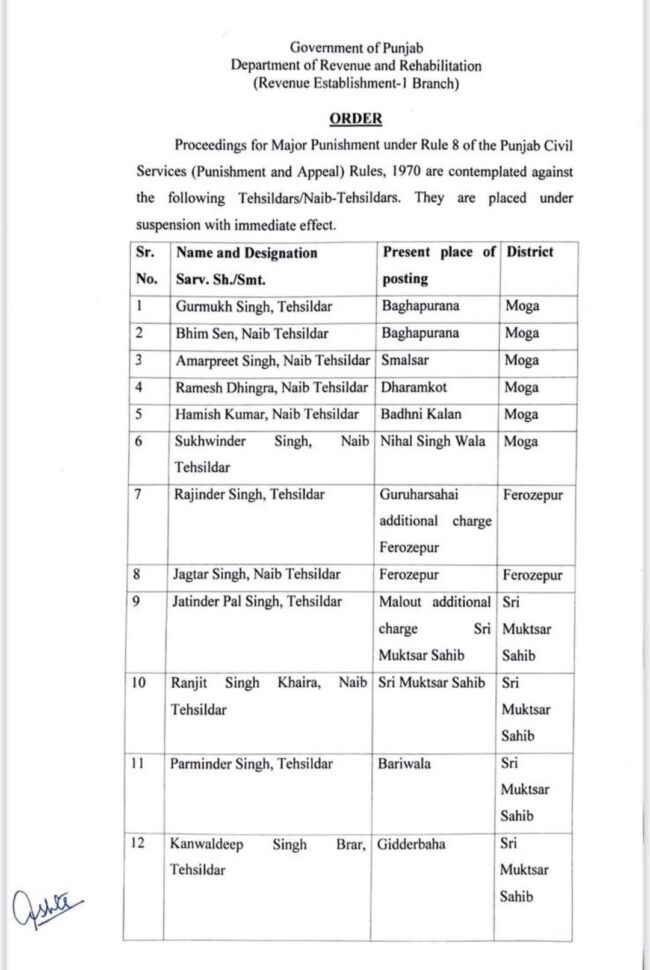 ਪੰਜਾਬ ਸਰਕਾਰ ਨੇ 14 ਤਹਿਸੀਲਦਾਰ ਤੇ ਨਾਇਬ ਤਹਿਸੀਲਦਾਰ ਕੀਤੇ ਮੁਅਤਲ