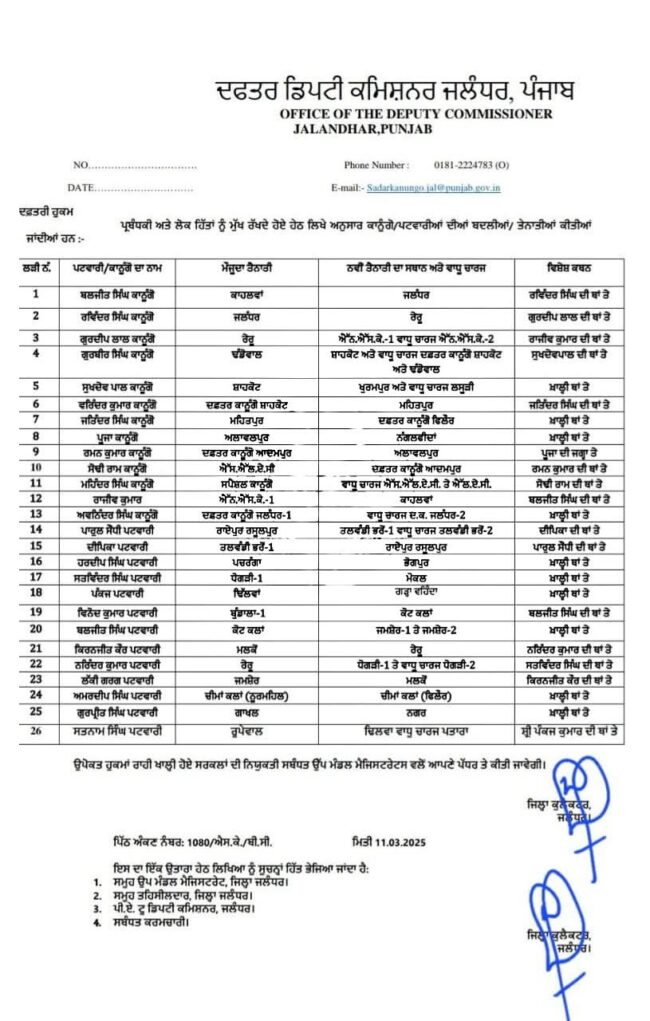 ਚੰਡੀਗੜ੍ਹ 12 ਮਾਰਚ। ਪੰਜਾਬ ਸਰਕਾਰ ਵੱਲੋਂ ਤਹਿਸੀਲਦਾਰਾਂ ਤੇ ਨੈਪ ਤਹਸੀਲਦਾਰਾਂ ਦੀਆਂ ਵੱਡੇ ਪੱਧਰ ਤੇ ਕੀਤੀਆਂ ਗਈਆਂ ਬਦਲੀਆਂ ਤੋਂ ਬਾਅਦ ਹੁਣ ਕਾਨੂੰਗੋ ਤੇ ਪਟਵਾਰੀ ਵੀ ਬਦਲੇ ਗਏ ਹਨ। ਜਲੰਧਰ ਵਿੱਚ ਕਾਨੂੰਗੋ ਤੇ ਪਟਵਾਰੀਆਂ ਦੇ ਵੱਡੇ ਪੱਧਰ ਤੇ ਤਬਾਦਲੇ ਕੀਤੇ ਗਏ ਹਨ। ਵੇਖੋ ਕਿਸ ਨੂੰ ਕਿੱਥੇ ਲਾਇਆ ਗਿਆ।