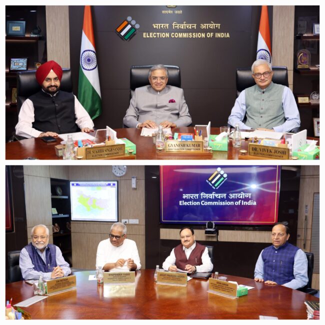 ਚੰਡੀਗੜ੍ਹ 9 ਮਈ। ਮੁੱਖ ਚੋਣ ਕਮਿਸ਼ਨਰ ਗਿਆਨੇਸ਼ ਕੁਮਾਰ ਅਤੇ ਚੋਣ ਕਮਿਸ਼ਨਰ ਡਾ. ਸੁਖਬੀਰ ਸਿੰਘ ਸੰਧੂ ਅਤੇ ਡਾ. ਵਿਵੇਕ ਜੋਸ਼ੀ ਨੇ ਵੀਰਵਾਰ ਨੂੰ ਨਿਰਵਾਚਨ ਸਦਨ, ਦਿੱਲੀ ਵਿਖੇ ਭਾਰਤੀ ਜਨਤਾ ਪਾਰਟੀ (ਭਾਜਪਾ) ਦੇ ਰਾਸ਼ਟਰੀ ਪ੍ਰਧਾਨ ਜਗਤ ਪ੍ਰਕਾਸ਼ ਨੱਡਾ ਨਾਲ ਆਏ ਪਾਰਟੀ ਵਫ਼ਦ ਨਾਲ ਵਿਚਾਰ ਵਟਾਂਦਰਾ ਕੀਤਾ। ਇਹ ਗੱਲਬਾਤ ਚੋਣ ਕਮਿਸ਼ਨ ਵੱਲੋਂ ਵੱਖ-ਵੱਖ ਰਾਸ਼ਟਰੀ ਅਤੇ ਸੂਬਾਈ ਰਾਜਨੀਤਿਕ ਪਾਰਟੀਆਂ ਦੇ ਪ੍ਰਧਾਨਾਂ ਨਾਲ ਕੀਤੇ ਜਾ ਰਹੇ ਵਿਚਾਰ ਵਟਾਂਦਰੇ ਦੀ ਲੜੀ ਦਾ ਹਿੱਸਾ ਹੈ।