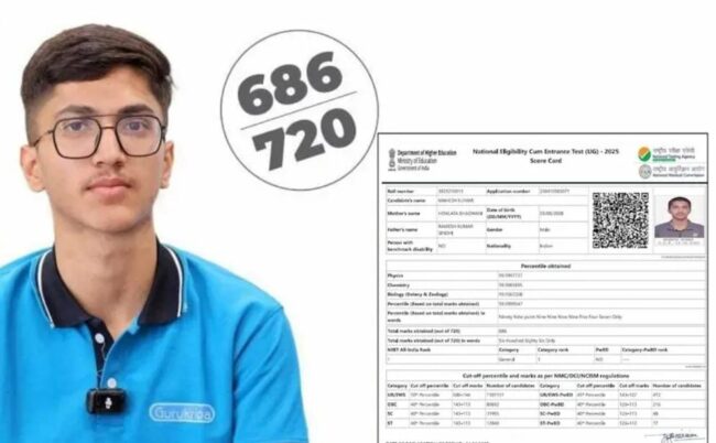 ਨੀਟ 2025 ਦੇ ਐਲਾਨੇਗਏ ਨਤੀਜੇ ’ਚ ਰਾਜਸਥਾਨ ਦੇ ਵਿਦਿਆਰਥੀਆਂ ਨੇ ਝੰਡਾ ਲਹਿਰਾਇਆ ਹੈ। ਰਾਜਸਥਾਨ ਦੇ ਹਨੂੰਮਾਨਗੜ੍ਹ ਜ਼ਿਲੇ ਤੋਂ ਟਾਪਰ ਮਹੇਸ਼ ਕੁਮਾਰ ਨੇ 99.99% ਅੰਕ ਪ੍ਰਾਪਤ ਕਰਕੇ ਏਆਈਆਰ -1 ਹਾਸਲ ਕੀਤਾ ਹੈ। ਇਸ ਪ੍ਰੀਖਿਆ ਵਿੱਚ ਦੇਸ਼ ਭਰ ਤੋਂ 22 ਲੱਖ ਤੋਂ ਵੱਧ ਵਿਦਿਆਰਥੀਆਂ ਨੇ ਹਿੱਸਾ ਲਿਆ ਸੀ, ਜਿਨ੍ਹਾਂ ’ਚੋਂ 12 ਲੱਖ ਤੋਂ ਵੱਧ ਵਿਦਿਆਰਥੀ ਸਫਲ ਹੋਏ ਸਨ। ਇਸ ਦੇ ਨਾਲ ਹੀ, 9 ਮੁੰਡੇ ਅਤੇ 1 ਕੁੜੀ ਨੇ ਟੌਪ 10 ’ਚ ਆਪਣੀ ਜਗ੍ਹਾ ਬਣਾਈ ਹੈ।