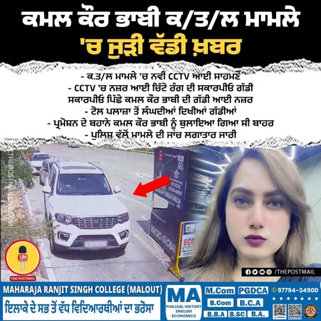 ਕਮਲ ਕੌਰ ਭਾਬੀ ਕਤਲ ਮਾਮਲੇ ਵਿਚ ਇਕ ਵੱਡੀ ਅਪਡੇਟ ਸਾਹਮਣੇ ਆਈ ਹੈ। ਅੱਜ ਇਸ ਮਾਮਲੇ ਵਿਚ ਇਕ ਟੋਲ ਪਲਾਜੇ ਤੋਂ ਗੱਡੀਆਂ ਲੰਘਦੀਆਂ ਦਿਖਾਈ ਦੇ ਰਹੀਆਂ ਹਨ। ਇਹ ਵੀਡੀਓ ਕਿਸੇ ਟੌਲ ਪਲਾਜੇ ਦੀ ਦੱਸੀ ਜਾ ਰਹੀ ਹੈ। ਸੀਸੀਟੀਵੀ ਚ ਇਕ ਚਿੱਟੇ ਰੰਗ ਦੀ ਸਕਾਰਪੀਓ ਗੱਡੀ ਦਿਖਾਈ ਦੇ ਰਹੀ ਹੈ। ਪ੍ਰਮੋੇਸ਼ਨ ਦੇ ਬਾਹਨੇ ਕਮਲ ਕੌਰ ਭਾਬੀ ਨੂੰ ਬੁਲਾਇਆ ਗਿਆ ਸੀ ਅਤੇ ਉਸ ਤੋਂ ਬਾਅਦ ਉਸਦਾ ਕ-ਤ-ਲ ਕਰ ਦਿੱਤਾ ਗਿਆ ਸੀ। ਬਠਿੰਡਾ ਪੁਲਸ ਵੱਲੋਂ ਲਗਾਤਾਰ ਮਾਮਲੇ ਦੀ ਜਾਂਚ ਕੀਤੀ ਜਾ ਰਹੀ ਹੈ।