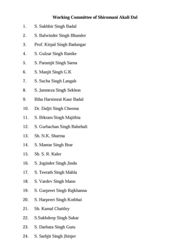 ਸ਼੍ਰੋਮਣੀ ਅਕਾਲੀ ਦਲ ਨੇ 96 ਮੈਂਬਰੀ ਵਰਕਿੰਗ ਕਮੇਟੀ ਐਲਾਨੀ