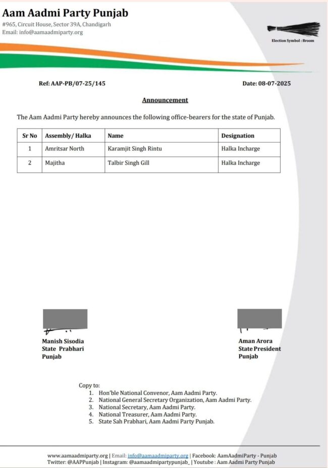 ਆਮ ਆਦਮੀ ਪਾਰਟੀ ਨੇ ਦੋ ਹਲਕਾ ਇੰਚਾਰਜ ਲਾਏ