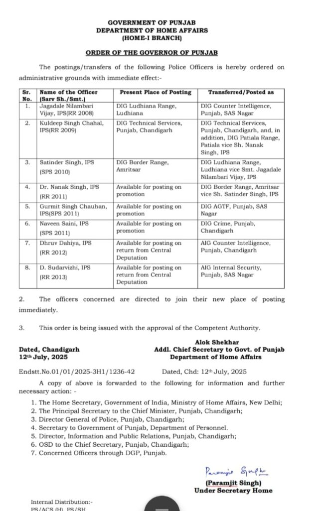 ਵਿਧਾਨ ਸਭਾ ਸੈਸ਼ਨ ਦੌਰਾਨ ਪੰਜਾਬ ਸਰਕਾਰ ਵੱਲੋਂ ਵੱਡੇ ਪੁਲਿਸ ਅਧਿਕਾਰੀਆਂ ਦੇ ਤਬਾਦਲੇ ਕੀਤੇ ਗਏ ਹਨ ਜਿਸ ਤਹਿਤ ਡੀਆਈਜੀ ਪਟਿਆਲਾ ਰੇਂਜ ਨਾਨਕ ਸਿੰਘ ਨੂੰ ਡੀਆਈਜੀ ਬਾਰਡਰ ਰੇਂਜ ਅੰਮ੍ਰਿਤਸਰ ਲਾਇਆ ਗਿਆ ਹੈ। ਜਦੋਂ ਕਿ ਕੁਲਦੀਪ ਚਾਹਲ ਨੂੰ ਡੀਆਈਜੀ ਪਟਿਆਲਾ ਰੇਂਜ ਲਾਇਆ ਗਿਆ ਹੈ।