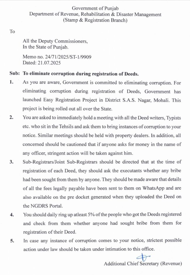 ਜਿਸ ਵਿੱਚ ਦਸਤਾਵੇਜ਼ਾਂ ਦੀ ਰਜਿਸਟ੍ਰੇਸ਼ਨ ਦੌਰਾਨ ਭ੍ਰਿਸ਼ਟਾਚਾਰ ਨੂੰ ਖਤਮ ਕਰਨ ਬਾਰੇ ਨਿਰਦੇਸ਼ ਜਾਰੀ ਕੀਤੇ ਗਏ ਹਨ। ਲਿਖੇ ਪੱਤਰ ਵਿੱਚ ਡਿਪਟੀ ਕਮਿਸ਼ਨਰਾਂ ਨੂੰ ਕਿਹਾ ਗਿਆ ਹੈ ਕਿ