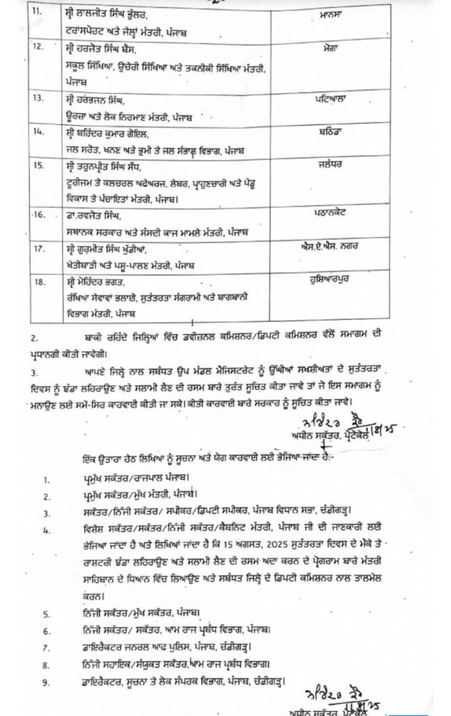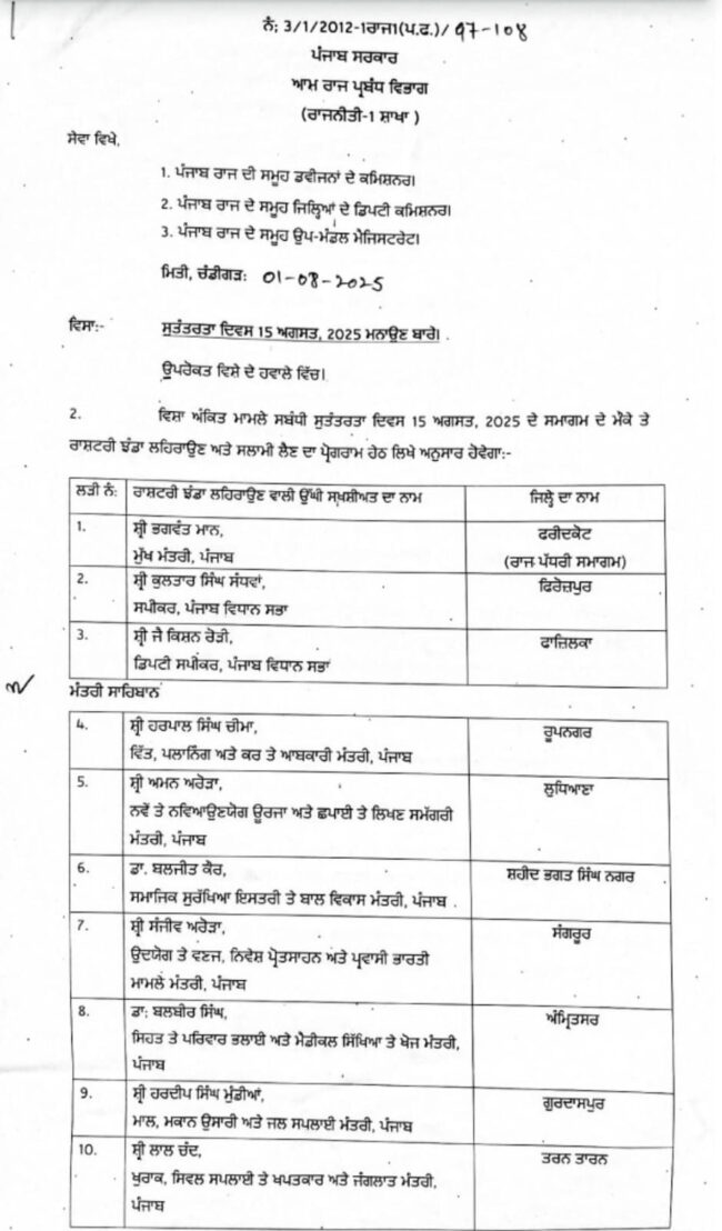 ਚੰਡੀਗੜ੍ਹਇਕ 1 ਅਗਸਤ। 15 ਅਗਸਤ ਨੂੰ ਆਜ਼ਾਦੀ ਦਿਹਾੜੇ ਮੌਕੇ ਪੰਜਾਬ ਦੇ ਵੱਖ-ਵੱਖ ਜ਼ਿਲਿਆਂ ਵਿੱਚ ਮੁੱਖ ਮੰਤਰੀ ਸਮੇਤ ਕੈਬਨਿਟ ਮੰਤਰੀ ਕਿੱਥੇ ਕਿੱਥੇ ਝੰਡਾ ਲਹਿਰਾਉਣਗੇ। ਇਸ ਸਬੰਧੀ ਪੰਜਾਬ ਸਰਕਾਰ ਵੱਲੋਂ ਸੂਚੀ ਜਾਰੀ ਕਰ ਦਿੱਤੀ ਗਈ ਹੈ। ਪੰਜਾਬ ਦੇ ਮੁੱਖ ਮੰਤਰੀ ਭਗਵੰਤ ਸਿੰਘ ਮਾਨ ਫਰੀਦਕੋਟ ਵਿਖੇ ਰਾਜ ਪੱਧਰੀ ਸਮਾਗਮ ਦੌਰਾਨ ਝੰਡਾ ਲਹਿਰਾਉਣ ਦੀ ਰਸਮ ਅਦਾ ਕਰਨਗੇ। ਪੰਜਾਬ ਵਿਧਾਨ ਸਭਾ ਦੇ ਸਪੀਕਰ ਕੁਲਤਾਰ ਸਿੰਘ ਸੰਧਵਾਂ ਫਿਰੋਜ਼ਪੁਰ ਤੇ ਡਿਪਟੀ ਸਪੀਕਰ, ਸ੍ਰੀ ਜੈ ਕਿਸ਼ਨ ਰੌੜੀ ਫਾਜਿਲਕਾ ਵਿਖੇ ਕੌਮੀ ਝੰਡਾ ਲਹਿਰਾਉਣਗੇ।