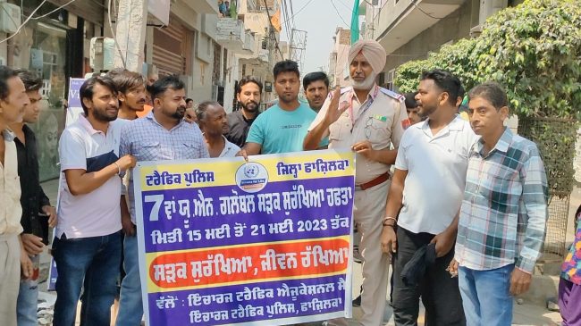 ਡਿਪਟੀ ਕਮਿਸ਼ਨਰ ਡਾ. ਸੇਨੂੰ ਦੁੱਗਲ ਆਈ.ਏ.ਐੱਸ ਨੇ ਦੱਸਿਆ ਕਿ ਪੰਜਾਬ ਸਟੇਟ ਰੋਡ ਸੇਫਟੀ ਕੌਂਸਲ ਅਤੇ ਟਰਾਂਸਪੋਰਟ ਵਿਭਾਗ ਪੰਜਾਬ ਵੱਲੋਂ ਆਮ ਲੋਕਾਂ ਨੂੰ ਟ੍ਰੈਫਿਕ ਨਿਯਮਾਂ ਸਬੰਧੀ ਜਾਗਰੂਕ ਕਰਨ ਲਈ 7 ਵਾਂ ਯੂ.ਐਨ. ਗਲੋਬਲ ਸੜਕ ਸੁਰੱਖਿਆ ਹਫਤਾ ਮਿਤੀ 15 ਮਈ ਤੋਂ 21 ਮਈ 2023 ਤੱਕ ਮਨਾਇਆ ਜਾ ਰਿਹਾ ਹੈ ਤਾਂ ਜੋ ਸੜਕੀ ਹਾਦਸਿਆਂ ਨੂੰ ਠੱਲ੍ਹ ਪਾਈ ਜਾ ਸਕੇ। ਜ਼ਿਲ੍ਹਾ ਫਾਜ਼ਿਲਕਾ ਵਿਖੇ ਵੀ ਇਸ ਸੜਕ ਸੁਰੱਖਿਆ ਹਫਤੇ ਦੀ ਸ਼ੁਰਆਤ ਕਰ ਦਿੱਤੀ ਗਈ ਹੈ।