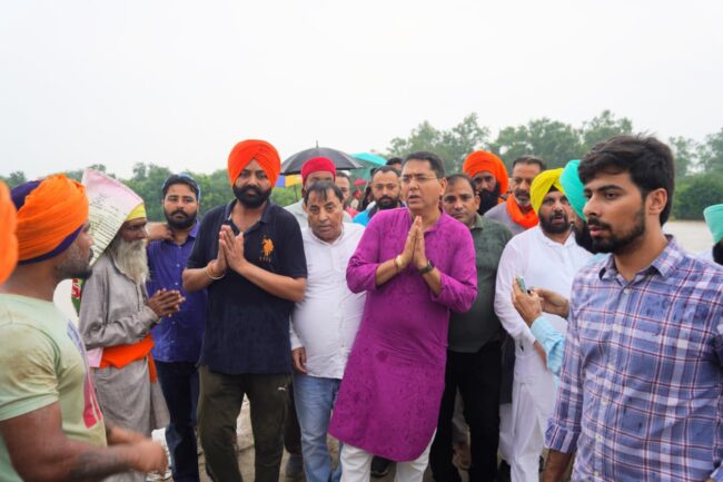 ਵਰਦੇ ਮੀਂਹ ਵਿੱਚ ਕੈਬਨਿਟ ਮੰਤਰੀਆਂ ਨੇ ਸਤਲੁਜ ਦਰਿਆ ਦੇ ਨਾਲ ਲੱਗਦੇ ਧੁੱਸੀ ਬੰਨ੍ਹ ਤੇ ਪੈਂਦੇ ਪਿੰਡਾਂ ਦੇ ਲੋਕਾਂ ਦੀਆਂ ਮੁਸ਼ਕਿਲਾਂ ਸੁਣੀਆਂ।