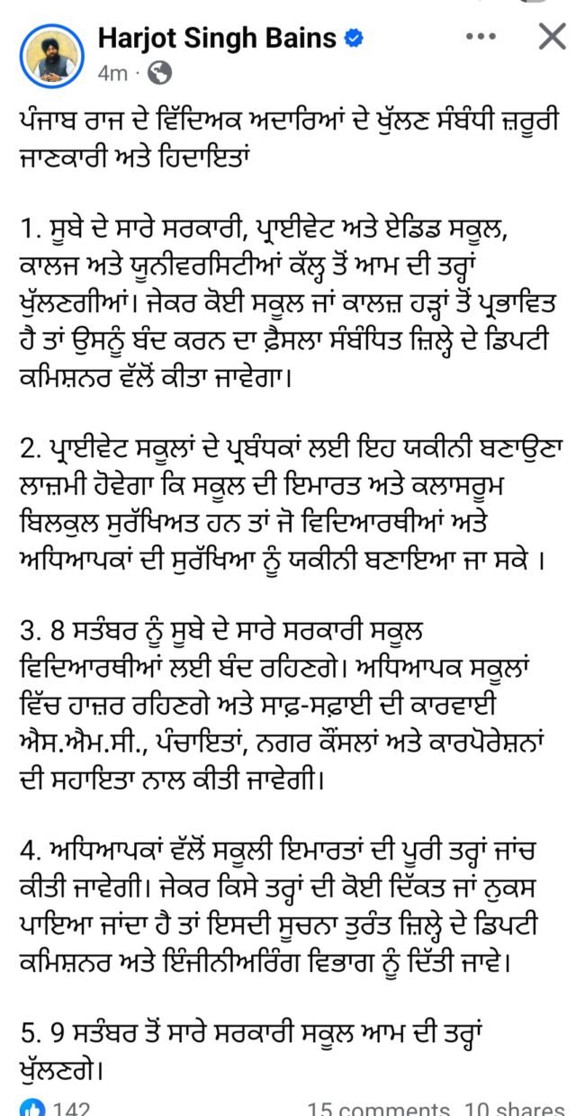 - ਸੂਬੇ ਦੇ ਸਾਰੇ ਸਰਕਾਰੀ, ਪ੍ਰਾਈਵੇਟ ਅਤੇ ਏਡਿਡ ਸਕੂਲ, ਕਾਲਜ ਅਤੇ ਯੂਨੀਵਰਸਿਟੀਆਂ ਕੱਲ੍ਹ ਤੋਂ ਆਮ ਦੀ ਤਰ੍ਹਾਂ ਖੁੱਲਣਗੀਆਂ। ਜੇਕਰ ਕੋਈ ਸਕੂਲ ਜਾਂ ਕਾਲਜ਼ ਹੜ੍ਹਾਂ ਤੋਂ ਪ੍ਰਭਾਵਿਤ ਹੈ ਤਾਂ ਉਸਨੂੰ ਬੰਦ ਕਰਨ ਦਾ ਫ਼ੈਸਲਾ ਸੰਬੰਧਿਤ ਜ਼ਿਲ੍ਹੇ ਦੇ ਡਿਪਟੀ ਕਮਿਸ਼ਨਰ ਵੱਲੋਂ ਕੀਤਾ ਜਾਵੇਗਾ।
