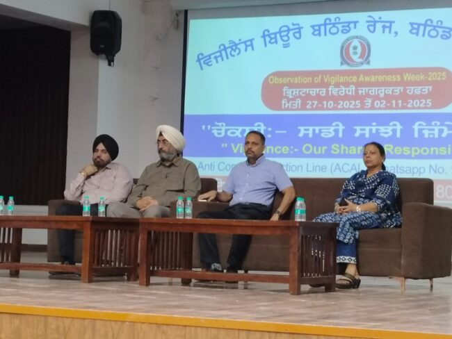 ਬਠਿੰਡਾ, 31 ਅਕਤੂਬਰ : ਚੀਫ ਡਾਇਰੈਕਟਰ ਵਿਜੀਲੈਂਸ ਬਿਊਰੋ, ਪੰਜਾਬ ਚੰਡੀਗੜ੍ਹ ਪ੍ਰਵੀਨ ਕਮਾਰ ਸਿਨਹਾ ਦੀ ਰਹਿਨੁਮਾਈ ਹੇਠ ਭ੍ਰਿਸ਼ਟਾਚਾਰ ਵਿਰੁੱਧ ਲੋਕਾਂ ਨੂੰ ਜਾਗਰੂਕ ਕਰਨ ਸਬੰਧੀ ਮਿਤੀ 27 ਅਕਤੂਬਰ 2025 ਤੋਂ 2 ਨਵੰਬਰ 2025 ਤੱਕ ਜ਼ਿਲ੍ਹੇ ਵਿੱਚ ਕਰਵਾਏ ਜਾ ਰਹੇ ਸੈਮੀਨਾਰਾਂ ਦੀ ਲੜ੍ਹੀ ਤਹਿਤ ਅੱਜ ਸਥਾਨਕ ਰਾਜਿੰਦਰਾ ਕਾਲਜ ਵਿਖੇ ਸੈਮੀਨਾਰ ਕਰਵਾਇਆ ਗਿਆ। ਇਸ ਸੈਮੀਨਾਰ ਵਿੱਚ ਵਧੀਕ ਡਿਪਟੀ ਕਮਿਸ਼ਨਰ (ਸ਼ਹਿਰੀ ਵਿਕਾਸ) ਸ੍ਰੀ ਨਰਿੰਦਰ ਸਿੰਘ ਧਾਲੀਵਾਲ ਨੇ ਮੁੱਖ ਮਹਿਮਾਨ ਵਜੋਂ ਸ਼ਿਰਕਤ ਕੀਤੀ।