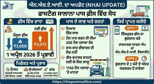 ਦਿੱਲੀ 16 ਮਾਰਚ। ਟੋਲ ਟੈਕਸ ਤੇ ਫਾਸਟ ਟੈਗ ਨੂੰ ਲੈ ਕੇ ਵੱਡੀ ਅਪਡੇਟ ਸਾਹਮਣੇ ਆਈ ਹੈ। 1 ਅਪ੍ਰੈਲ ਤੋਂ ਨਵੇਂ ਨਿਯਮ ਲਾਗੂ ਹੋਣ ਜਾ ਰਹੇ ਹਨ। ਜਾਣਕਾਰੀ ਅਨੁਸਾਰ ਐਨਐਚਏਆਈ ਨੇ ਫਾਸਟ ਟੈਗ ਸਲਾਨਾ ਪਾਸ ਫੀਸ ਵਿੱਚ ਵਾਧਾ ਕੀਤਾ ਹੈ ਤੇ ਇਸ ਵਾਧੇ ਤਹਿਤ 3000 ਸਾਲਾਨਾ ਫੀਸ ਦੇ ਮੁਕਾਬਲੇ ਹੁਣ 3075 ਸਾਲਾਨਾ ਫੀਸ ਲੱਗਿਆ ਕਰੇਗੀ। ਇਹ ਨਵੇਂ ਨਿਯਮ 1 ਅਪ੍ਰੈਲ 2026 ਤੋਂ ਲਾਗੂ ਹੋਣਗੇ।