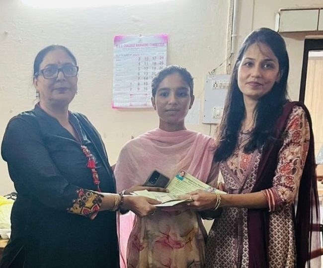 ਗੋਪੀਚੰਦ ਕਾਲਜ ਦੀ ਹੋਣਹਾਰ ਵਿਦਿਆਰਥਣ ਤਰਨਪ੍ਰੀਤ ਨੂੰ ਐਡਵੋਕੇਟ ਰਾਗਿਨੀ ਕੁੱਕੜ ਸਪੁੱਤਰੀ ਸ਼੍ਰੀ ਰਮੇਸ਼ ਚੰਦਰ ਕੁੱਕੜ ਨੇ 21000/- ਰੁਪਏ ਦੀ ਨਕਦ ਰਾਸ਼ੀ ਦੇ ਕੇ ਸਨਮਾਨਿਆ