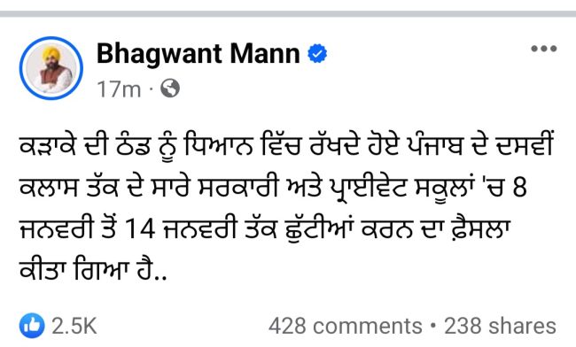 ਹੱਡ ਚੀਰਵੀਂ ਪੈ ਰਹੀ ਠੰਡ ਦੇ ਮੱਦੇ ਨਜ਼ਰ ਪੰਜਾਬ ਸਰਕਾਰ ਵੱਲੋਂ ਸਕੂਲਾਂ ਨੂੰ ਲੈ ਕੇ ਵੱਡਾ ਫੈਸਲਾ ਕੀਤਾ ਗਿਆ ਹੈ। ਪੰਜਾਬ ਦੇ ਸਾਰੇ ਸਕੂਲ 8 ਜਨਵਰੀ ਤੋਂ 14 ਜਨਵਰੀ ਤੱਕ ਬੰਦ ਕਰ ਦਿੱਤੇ ਗਏ ਹਨ। ਠੰਡ ਦੇ ਮੱਦੇ ਨਜ਼ਰ ਮੁੱਖ ਮੰਤਰੀ ਭਗਵੰਤ ਮਾਨ ਵੱਲੋਂ ਇਹ ਫੈਸਲਾ ਲਿਆ ਗਿਆ ਹੈ ਜਿਸ ਤਹਿਤ 8 ਜਨਵਰੀ ਤੋਂ 14 ਜਨਵਰੀ ਤੱਕ ਸੂਬੇ ਦੇ ਸਾਰੇ ਸਰਕਾਰੀ ਪ੍ਰਾਈਵੇਟ ਸਕੂਲਾਂ ਵਿੱਚ ਪਹਿਲੀ ਤੋਂ ਦਸਵੀਂ ਕਲਾਸ ਤੱਕ ਛੁੱਟੀਆਂ ਕੀਤੀਆਂ ਗਈਆਂ ਹਨ।