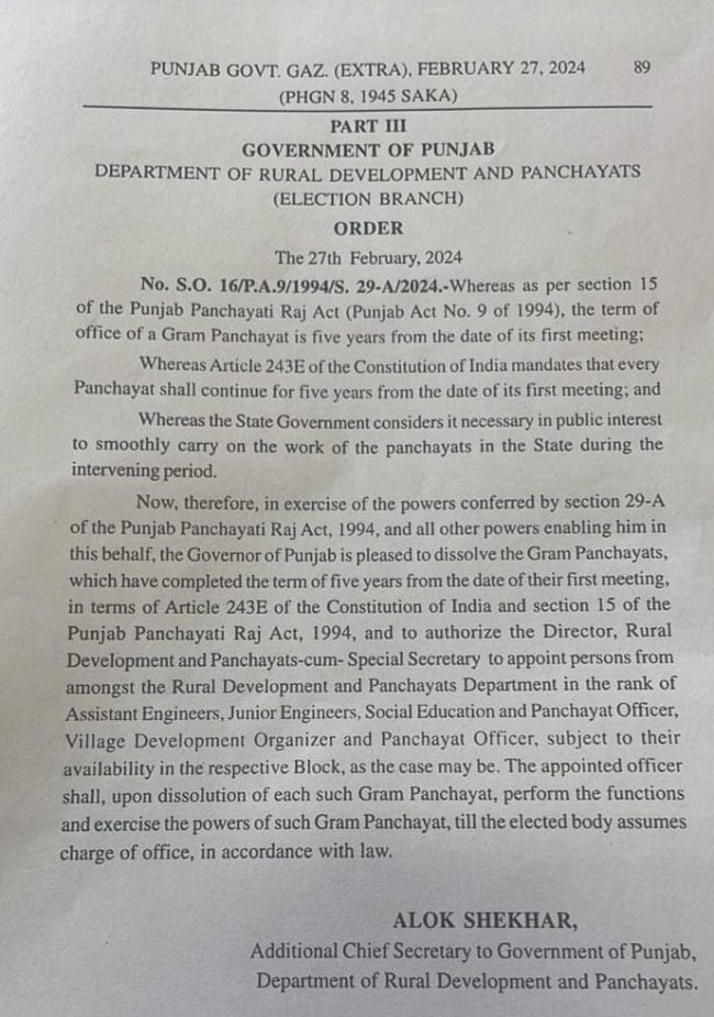ਪੰਜਾਬ ਸਰਕਾਰ ਨੇ ਸੂਬੇ ਦੀਆਂ ਪੰਚਾਇਤਾਂ ਭੰਗ ਕੀਤੀਆਂ