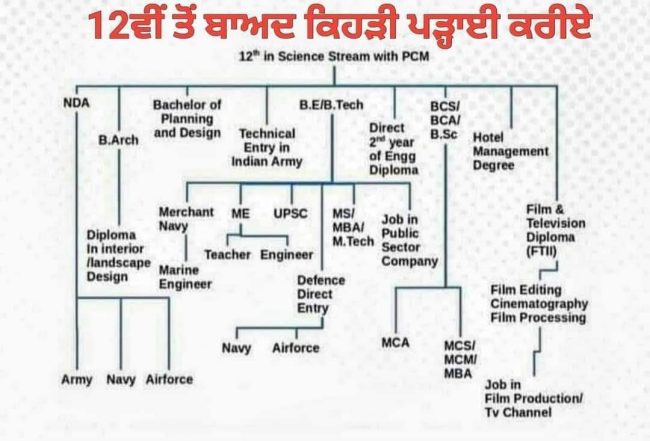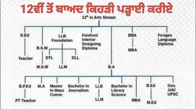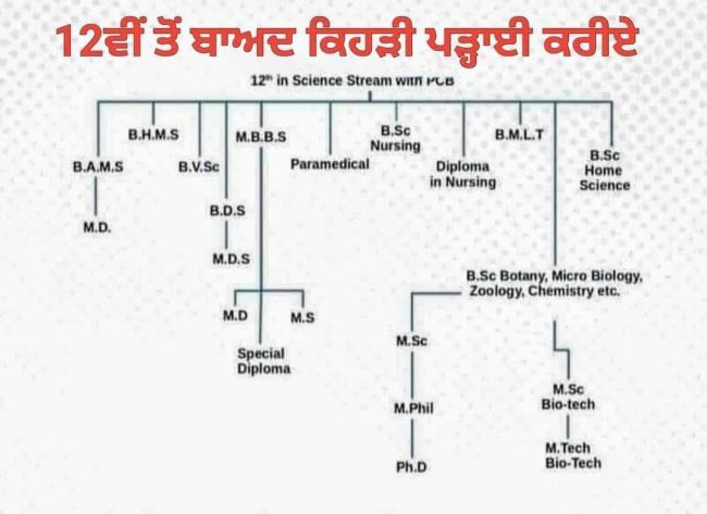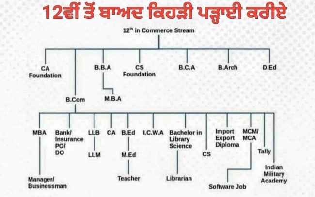 ਚੰਡੀਗੜ੍ਹ। ਜਦੋਂ ਬੱਚਾ ਗਿਆਰਵੀਂ ਜਾਂ ਬਾਰਵੀਂ ਵਿੱਚ ਹੁੰਦਾ ਹੈ ਤਾਂ ਮਾਪਿਆਂ ਨੂੰ ਉਦੋਂ ਤੋਂ ਹੀ ਚਿੰਤਾ ਹੋਣੀ ਸ਼ੁਰੂ ਹੋ ਜਾਂਦੀ ਹੈ ਕਿ ਆਖਿਰ ਬੱਚਿਆਂ ਨੂੰ +2 ਬਾਅਦ ਕੀ ਕਰਵਾਇਆ ਜਾਵੇ। ਬੱਚਿਆਂ ਦੇ ਸੁਨਹਿਰੇ ਭਵਿੱਖ ਨੂੰ ਲੈ ਕੇ ਮਾਪੇ ਅਕਸਰ ਹੀ ਦੁਚਿੱਤੀ ਵਿੱਚ ਰਹਿੰਦੇ ਹਨ। ਇਹ ਜਾਣਕਾਰੀ ਉਨਾਂ ਸਾਰੇ ਮਾਪਿਆਂ ਤੇ ਉਨਾਂ ਦੇ ਬੱਚਿਆਂ ਲਈ ਹੈ ਜਿਨਾਂ ਦੇ ਬੱਚੇ ਗਿਆਰਵੀਂ ਜਾਂ ਬਾਰਵੀਂ ਕਲਾਸ ਵਿੱਚ ਹਨ ਜਾਂ ਉਨਾਂ ਨੇ ਪੇਪਰ ਦੇ ਦਿੱਤੇ ਹਨ। ਇਸ ਖਬਰ ਨੂੰ ਪੂਰਾ ਪੜ੍ਹਨਾ ਤੇ ਅੱਗੇ ਤੋਂ ਅੱਗੇ ਸ਼ੇਅਰ ਜਰੂਰ ਕਰਨਾ ਇਹ ਤੁਹਾਡੇ ਤੇ ਤੁਹਾਡੇ ਬੱਚਿਆਂ ਲਈ ਜਾਣਕਾਰੀ ਭਰਪੂਰ ਖਬਰ ਹੈ। ਖਬਰ ਦੇ ਨਾਲ ਜੋ ਤਸਵੀਰਾਂ ਦਿੱਤੀਆਂ ਗਈਆਂ ਹਨ ਉਹਨਾਂ ਵਿੱਚ ਸਾਰੀ ਜਾਣਕਾਰੀ ਹੈ ਕਿ ਤੁਹਾਡਾ ਬੱਚਾ ਕਾਮਰਸ, ਮੈਡੀਕਲ,ਨੋਨ ਮੈਡੀਕਲ ਆਰਟਸ ਵਿੱਚ +2 ਕਰਨ ਤੋਂ ਬਾਅਦ ਕਿਹੜੇ ਖੇਤਰ ਵਿੱਚ ਆਪਣਾ ਭਵਿੱਖ ਸੁਨਹਿਰੀ ਬਣਾ ਸਕਦਾ ਹੈ।