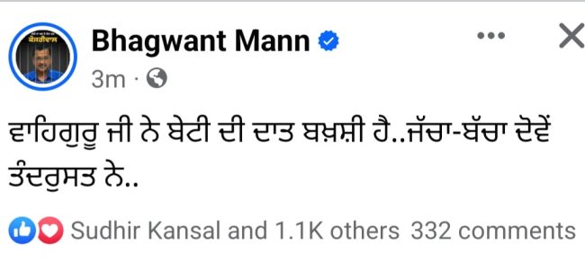26 ਜਨਵਰੀ ਮੌਕੇ ਮੁੱਖ ਮੰਤਰੀ ਭਗਵੰਤ ਮਾਨ ਨੇ ਕਿਹਾ ਸੀ ਕਿ ਮਾਰਚ ਮਹੀਨੇ ਵਿੱਚ ਉਹਨਾਂ ਦੇ ਘਰ ਖੁਸ਼ੀ ਆਉਣ ਵਾਲੀ ਹੈ ਤੇ ਅੱਜ ਉਹਨਾਂ ਦੇ ਘਰ ਬੇਟੀ ਦੇ ਰੂਪ ਵਿੱਚ ਖੁਸ਼ੀ ਆਈ ਹੈ। ਉਧਰ ਸੋਸ਼ਲ ਮੀਡੀਆ ਤੇ ਵੱਖ-ਵੱਖ ਆਗੂਆਂ ਵੱਲੋਂ ਮੁੱਖ ਮੰਤਰੀ ਨੂੰ ਵਧਾਈ ਦਿੱਤੀ ਜਾ ਰਹੀ ਹੈ।