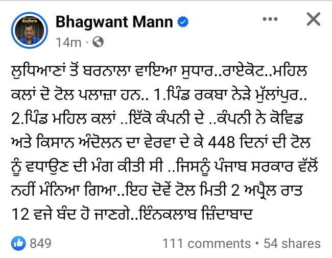 ਪੰਜਾਬ ਸਰਕਾਰ ਵੱਲੋਂ 2 ਅਪ੍ਰੈਲ ਤੋਂ ਦੋ ਹੋਰ ਟੋਲ ਪਲਾਜ਼ੇ ਬੰਦ ਕੀਤੇ ਜਾਣਗੇ। ਇਸ ਸਬੰਧੀ ਪੰਜਾਬ ਦੇ ਮੁੱਖ ਮੰਤਰੀ ਭਗਵੰਤ ਮਾਨ ਵੱਲੋਂ ਆਪਣੇ ਸੋਸ਼ਲ ਮੀਡੀਆ ਅਕਾਊਂਟਸ ਤੇ ਜਾਣਕਾਰੀ ਦਿੱਤੀ ਗਈ ਹੈ। ਉਹਨਾਂ ਦੱਸਿਆ ਕਿ ਲੁਧਿਆਣਾ ਤੋਂ ਬਰਨਾਲਾ ਵਾਇਆ ਸੁਧਾਰ ਰਾਏਕੋਟ ਮਹਿਲ ਕਲਾਂ ਦੇ ਕੋਲ ਦੋ ਟੋਲ ਪਲਾਜ਼ੇ ਹਨ। ਇੱਕ ਪਿੰਡ ਰਕਬਾ ਨੇੜੇ ਮੁੱਲਾਂਪੁਰ ਦੂਜਾ ਪਿੰਡ ਮਹਿਲ ਕਲਾਂ ਦੋਨੇ ਬੰਦ ਕੀਤੇ ਜਾ ਰਹੇ ਹਨ।ਇਹ ਦੋਨੇ ਟੋਲ ਪਲਾਜ਼ੇ 2 ਅਪ੍ਰੈਲ ਨੂੰ ਬੰਦ ਹੋਣਗੇ ਇਸ ਸਬੰਧ ਵਿੱਚ ਕੋਵਿਡ ਦਾ ਹਵਾਲਾ ਦੇ ਕੇ ਕੰਪਨੀ ਵੱਲੋਂ 400 ਤੋਂ ਵੱਧ ਦਿਨ ਹੋਰ ਮੰਗੇ ਗਏ ਸਨ। ਜਿਨਾਂ ਨੂੰ ਪੰਜਾਬ ਸਰਕਾਰ ਵੱਲੋਂ ਨਹੀਂ ਮੰਨਿਆ ਗਿਆ ਤੇ ਹੁਣ ਦੋ ਅਪ੍ਰੈਲ ਤੋਂ ਇਹ ਦੋਨੇ ਟੋਲ ਪਲਾਜ਼ੇ ਬੰਦ ਕੀਤੇ ਜਾਣਗੇ।