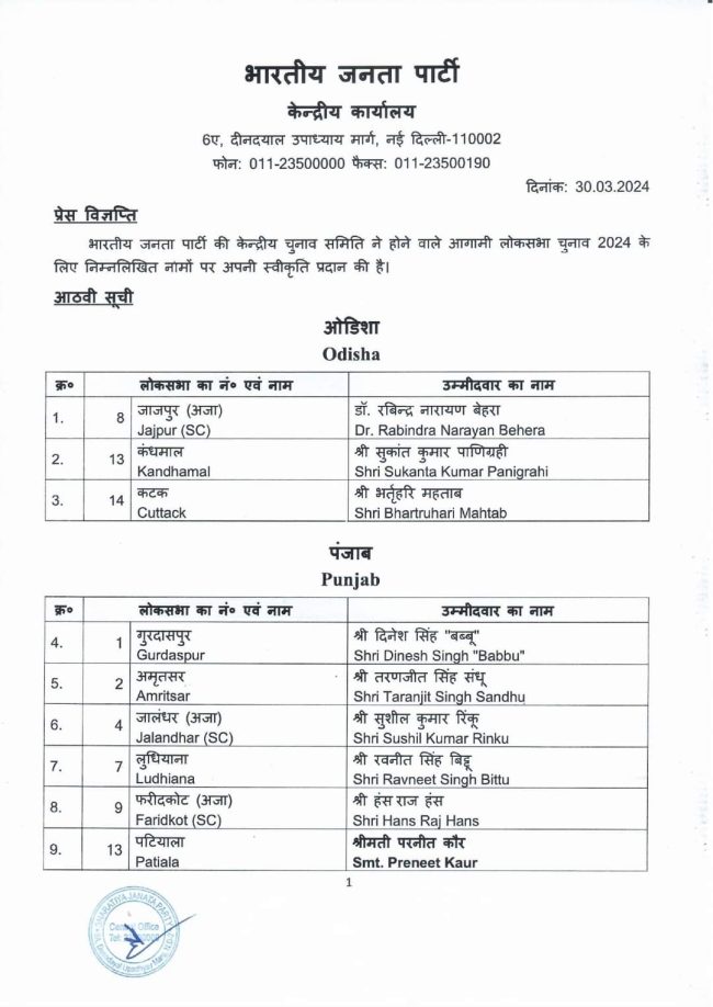 ਭਾਜਪਾ ਨੇ ਪੰਜਾਬ ਦੇ ਉਮੀਦਵਾਰਾਂ ਦੀ ਸੂਚੀ ਕੀਤੀ ਜਾਰੀ,ਵੇਖੋ ਕਿਸ ਨੂੰ ਕਿੱਥੋਂ ਮਿਲੀ ਟਿਕਟ