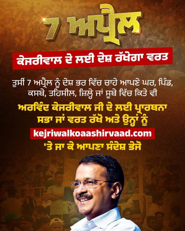 7 ਅਪ੍ਰੈਲ ਨੂੰ ਕੇਜਰੀਵਾਲ ਰਈ ਰੱਖੇ ਜਾਣਗੇ ਵਰਤ ਤੇ ਪ੍ਰਾਰਥਨਾ ਸਭਾ