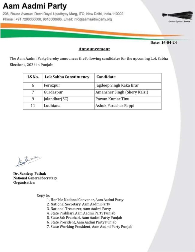 ਆਮ ਆਦਮੀ ਪਾਰਟੀ ਵੱਲੋਂ ਪੰਜਾਬ ਦੀਆਂ ਲੋਕ ਸਭਾ ਚੋਣਾਂ ਨੂੰ ਲੈ ਕੇ ਰਹਿੰਦੇ ਚਾਰ ਉਮੀਦਵਾਰਾਂ ਦਾ ਐਲਾਨ ਕਰ ਦਿੱਤਾ ਗਿਆ ਹੈ। ਇਸ ਤਹਿਤ ਫਿਰੋਜ਼ਪੁਰ ਲੋਕ ਸਭਾ ਹਲਕੇ ਤੋਂ ਜਗਦੀਪ ਸਿੰਘ ਕਾਕਾ ਬਰਾੜ ਵਿਧਾਇਕ ਸ਼੍ਰੀ ਮੁਕਤਸਰ ਸਾਹਿਬ ਨੂੰ ਉਮੀਦਵਾਰ ਐਲਾਨਿਆ ਗਿਆ ਹੈ। ਇਸ ਤੋਂ ਇਲਾਵਾ ਜਲੰਧਰ ਤੋਂ ਪਵਨ ਕੁਮਾਰ ਟੀਨੂ ਨੂੰ ਚੋਣ ਮੈਦਾਨ ਵਿੱਚ ਉਤਾਰਿਆ ਗਿਆ ਹੈ। ਗੁਰਦਾਸਪੁਰ ਤੋਂ ਅਮਨ ਸ਼ੇਰ ਸਿੰਘ ਸ਼ੈਰੀ ਕਲਸੀ ਨੂੰ ਉਮੀਦਵਾਰ ਬਣਾਇਆ ਗਿਆ ਹੈ। ਲੁਧਿਆਣਾ ਤੋਂ ਅਸ਼ੋਕ ਪਰਾਸ਼ਰ ਪੱਪੀ ਆਮ ਆਦਮੀ ਪਾਰਟੀ ਦੇ ਉਮੀਦਵਾਰ ਹੋਣਗੇ। ਆਮ ਆਦਮੀ ਪਾਰਟੀ ਵੱਲੋਂ ਪੰਜਾਬ ਦੀਆਂ 13 ਲੋਕ ਸਭਾ ਸੀਟਾਂ ਲਈ ਉਮੀਦਵਾਰਾਂ ਦਾ ਐਲਾਨ ਕਰ ਦਿੱਤਾ ਗਿਆ ਹੈ।
