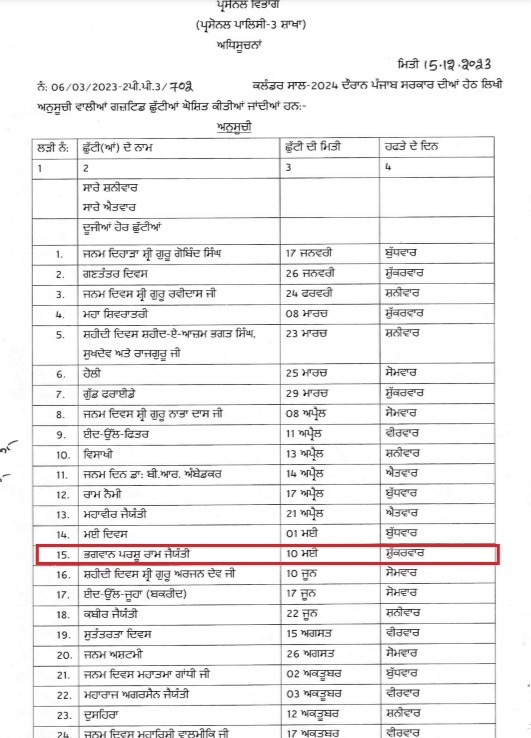 ਚੰਡੀਗੜ੍ਹ। ਪੰਜਾਬ ਸਰਕਾਰ ਵੱਲੋਂ ਜਾਰੀ ਕਲੰਡਰ ਮੁਤਾਬਕ ਸੂਬੇ ਵਿਚ 10 ਮਈ 2024 ਦਿਨ ਸ਼ੁੱਕਰਵਾਰ ਨੂੰ ਸਰਕਾਰੀ ਛੁੱਟੀ ਰਹੇਗੀ। ਇਸ ਦਿਨ ਸੂਬੇ ਭਰ ਦੇ ਸਕੂਲ, ਕਾਲਜ ਤੇ ਸਰਕਾਰੀ ਅਦਾਰਿਆਂ ਵਿਚ ਛੁੱਟੀ ਰਹੇਗੀ। ਦਰਅਸਲ 10 ਮਈ ਨੂੰ ਭਗਵਾਨ ਪਰਸ਼ੂ ਰਾਮ ਜਯੰਤੀ ਹੈ। ਜਿਸ ਕਾਰਨ ਪੰਜਾਬ ਸਰਕਾਰ ਵੱਲੋਂ ਇਸ ਦਿਨ ਦੀ ਸਰਕਾਰੀ ਛੁੱਟੀ ਐਲਾਨੀ ਗਈ ਹੈ।